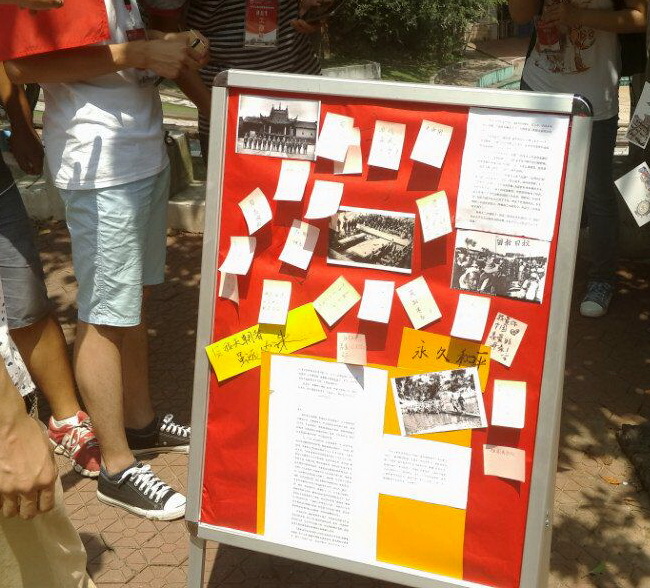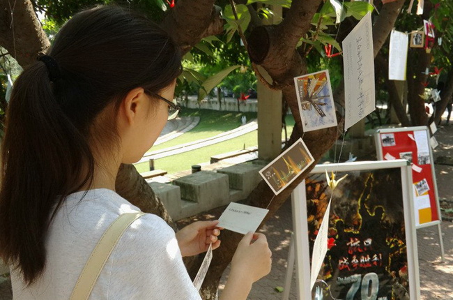 9月2日当天,院团委在校音乐台长廊旁的树上将面向14级员工征集的微短文的明信片、抗战相关照片、折成千纸鹤的彩纸一一悬挂到树上,并在长廊起点摆上抗战周年纪念海报,挂上鲜红的党旗。明信片上的微短文各具特色,引人入胜,有对先烈的缅怀与感恩,有对现实的珍惜与感慨,也有对未来的展望和信心。简易的时光长廊人来人往,树枝上随风摆动的展品吸引着同学们纷纷驻足,揭一封明信片,读一段故事,悟一番深沉,添一丝动力,留一份回忆。